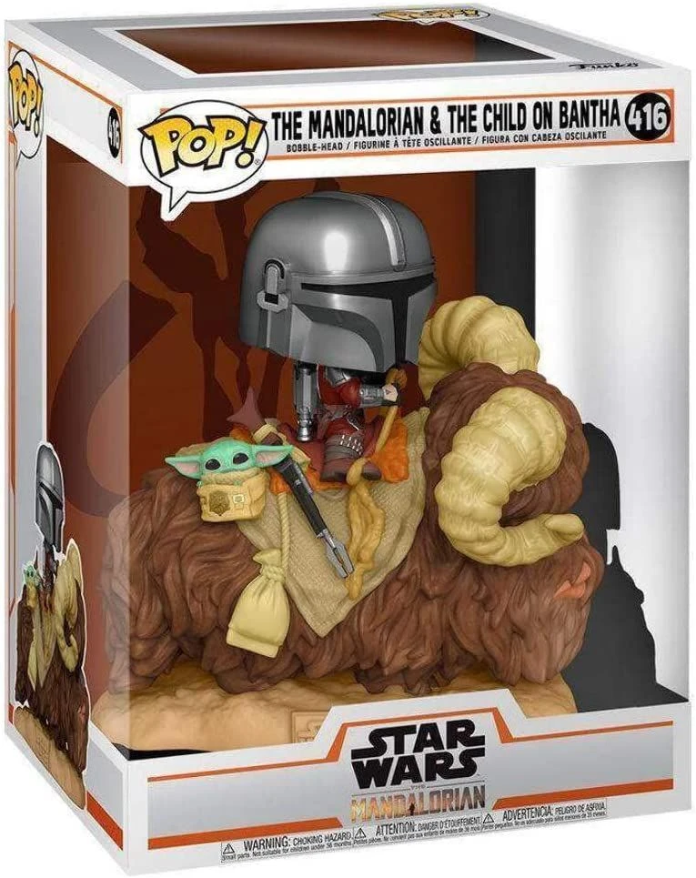 Funko POP! Figur vom Mandalorian, zusammen mit Baby Yoda auf seinem Reittier “Bantha”.
