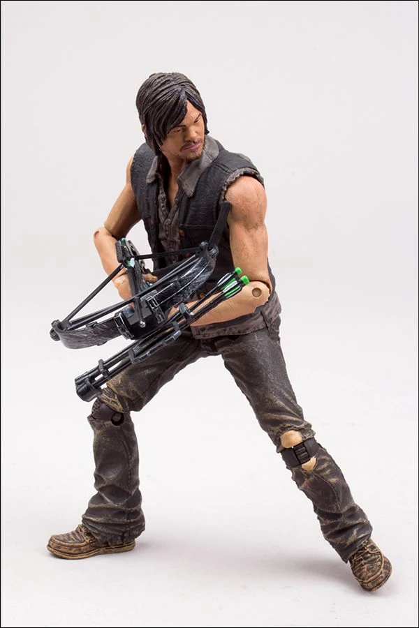Die bewegliche Figur von Daryl Dixon kommt mit seiner Biker Weste, Jagdmesser und Armbrust.