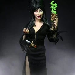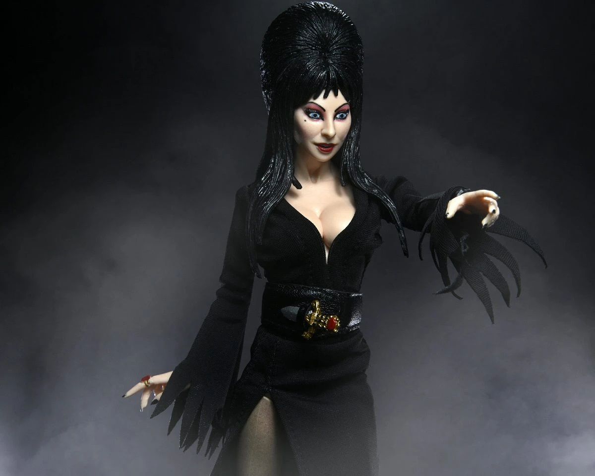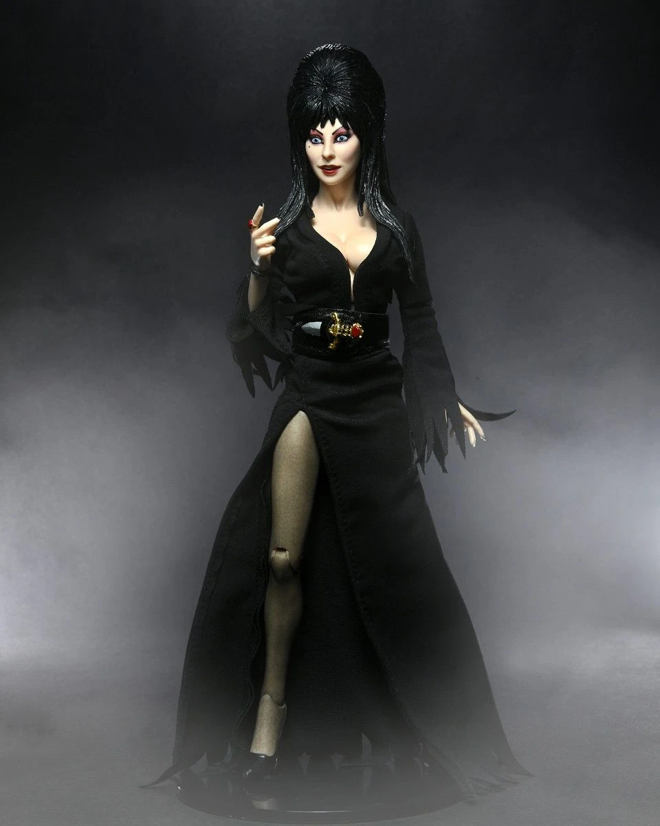 Die berühmte Elvira, Mistress fo the Darkness, als 20cm große clothed Actionfigur von NECA. Wir feiern 40 Jahre Elvira, Herrin der Dunkelheit! Die teuflisch entzückende Cassandra Peterson spielt die Rolle der Elvira seit 40 Jahren mit Anmut, Humor und mehr als nur einem kleinen Übermut. NECA ist stolz darauf, diese teuflisch fantastische Figur für Ihre Horror-Sammlung zu präsentieren. Die 20,3 cm große Elvira-Actionfigur ist voll beweglich und verfügt über maßgeschneiderte Stoffkleidung sowie jede Menge Zubehör … abwechselnd blinzelnder Kopf, Schädel, Kelch, Figurenständer und ihr charakteristischer Dolch, der in eine Schlaufe am Gürtel passt.