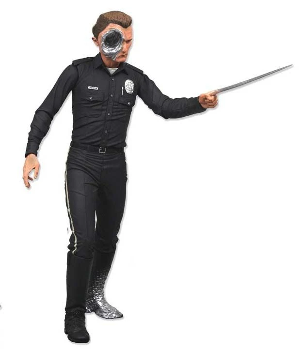 Die Figur zeigt den T-1000 (Robert Patrick) bei seiner Attacke im Stahlwerk mit starker Deformation im Gesicht (man kann hindurchsehen), teilweise verflüssigtem Bein und zum Dolch geformten Zeigefinger.